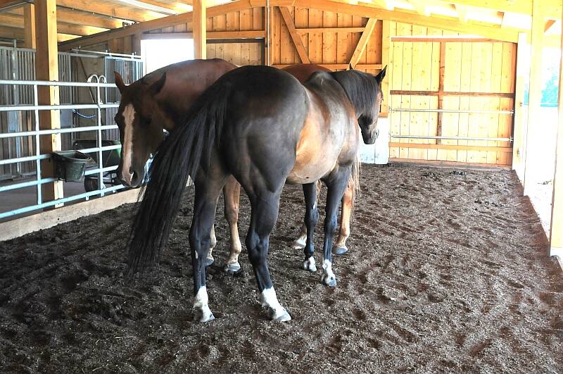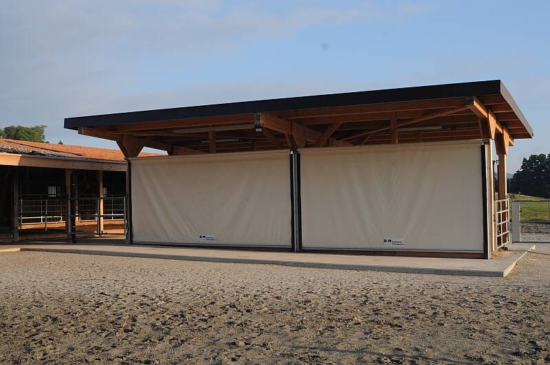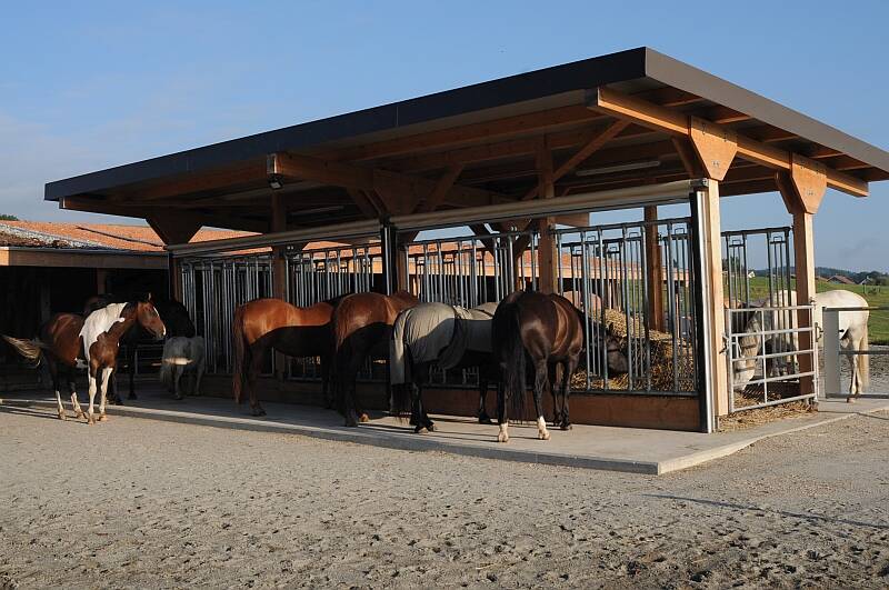 Unsere Pferdepension zeichnet sich durch eine moderne Offenstallhaltung aus. Die Pferde werden in zwei Gruppen aufgeteilt. Die erste Gruppe hat ständig Zugang zu den Heuraufen und der zweiten Gruppe wird das Futter mit Hilfe einer zeitlich gesteuerten Futterplane rationiert.